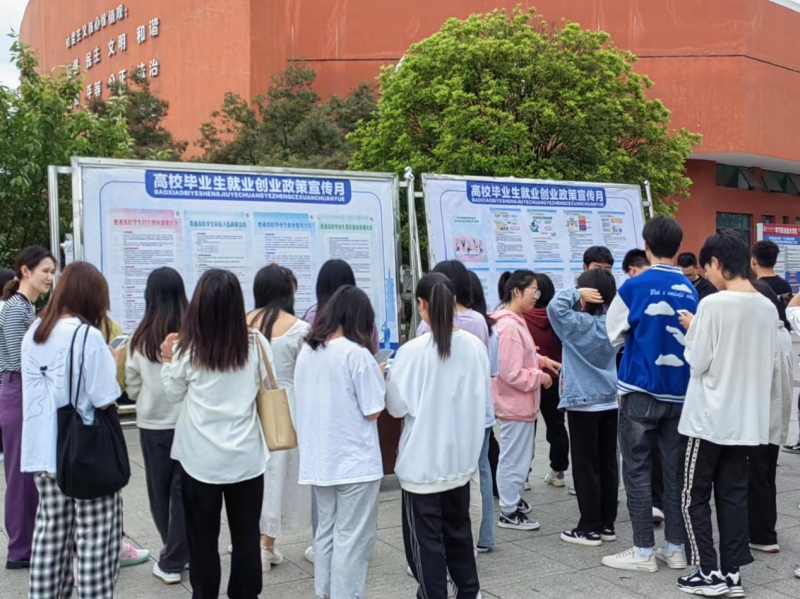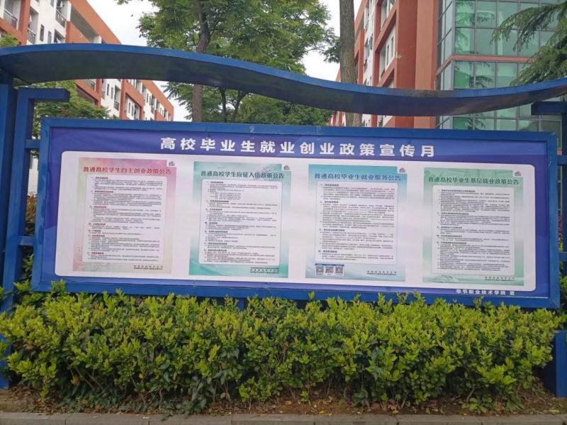 为求就业创业政策宣传有实效有长效,校园各处的宣传栏、展板都张贴了就业政策宣传资料,同时通过就业信息网、微信公众号等平台发布就业政策宣讲,确保学生能更深入地了解国家相关政策。
