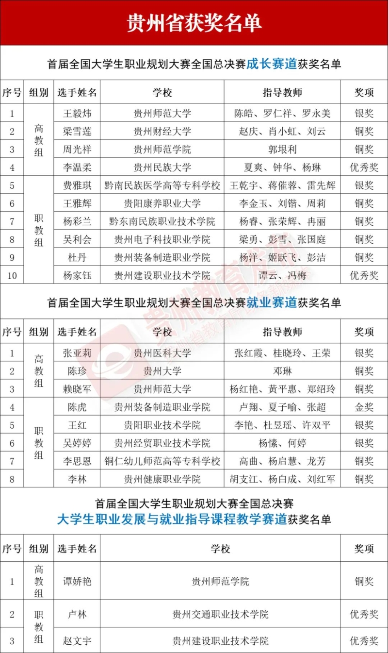 近日,教育部印发《关于公布首届全国大学生职业规划大赛全国总决赛获奖名单的通知》,正式公布大赛学生成长赛道、学生就业赛道、大学生职业发展与就业指导课程教学赛道等总决赛获奖名单。贵州共21人获奖,详情一起来看——
