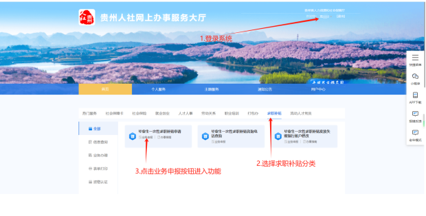 符合条件的毕业生通过“贵州人社”微信小程序、“贵州人社”APP或登录“贵州人社网上办事服务大厅”官方网站注册并登录个人账号,进入“毕业生一次性求职补贴申请”模块,如实、准确、完整填写个人申请信息后,进行网上申报。贵州人社网上办事服务大厅官网网址: