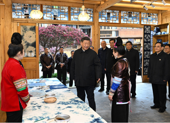 3月17日至18日,中共中央总书记、国家主席、中央军委主席习近平在贵州考察。这是17日下午,习近平在黔东南州黎平县肇兴侗寨侗乡特色产业基地考察。新华社记者 谢环驰 摄