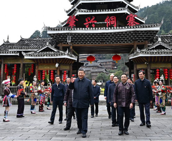 3月17日至18日,中共中央总书记、国家主席、中央军委主席习近平在贵州考察。这是17日下午,习近平在黔东南州黎平县肇兴侗寨考察时,在寨门口向身着民族盛装欢迎的村民挥手致意。新华社记者 燕雁 摄