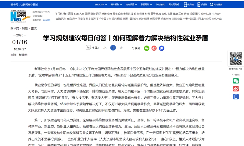 新华社北京1月16日电 《中共中央关于制定国民经济和社会发展第十五个五年规划的建议》提出:“着力解决结构性就业矛盾。”这项举措明确了“十五五”时期就业工作的重要着力点,对新形势下促进高质量充分就业具有重要意义。